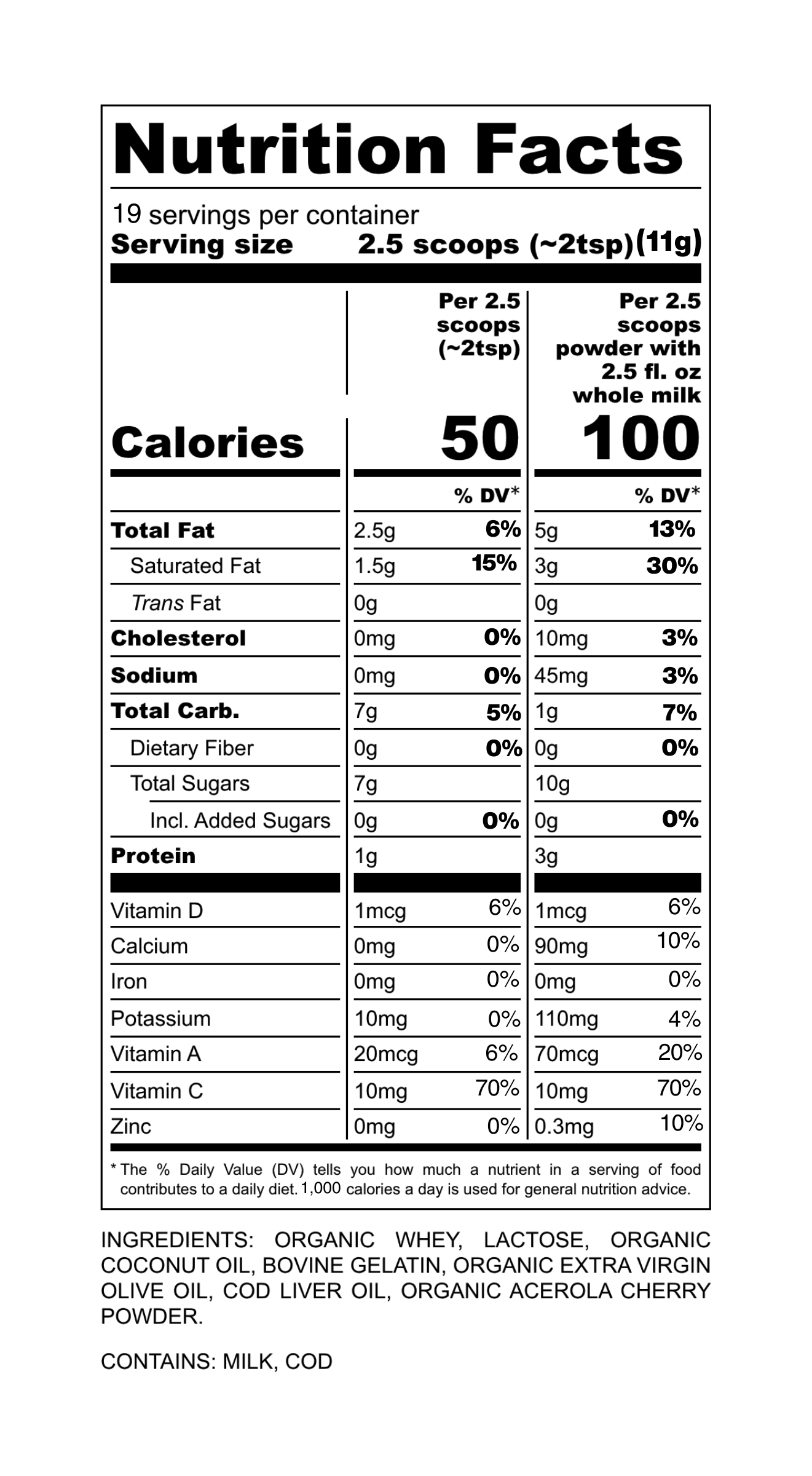 Organic Whey, Lactose, Gelatin, Organic Coconut Oil, Cod Liver Oil, Organic Extra Virgin Olive Oil, Organic Acerola Powder.